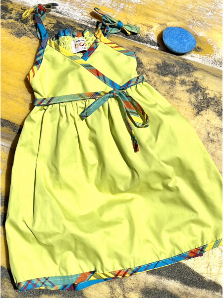 Une des plus traditionnelles robes se présente avec un mélange de madras et de coton. La robe Brigitte se distingue avec ses bretelles réglable et d'un élastique dévoilant la beauté des épaules ; smockée au niveau du haut elle joue la carte de la vraie représentation des caraïbes françaises.