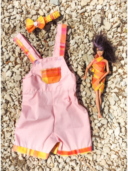 Une salopette rose de style créole, larges bretelles réglable en madras et une poche de devant en madras.