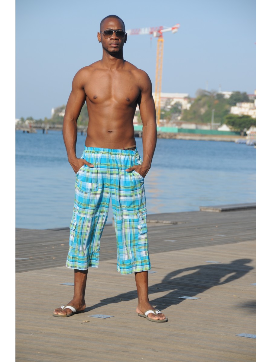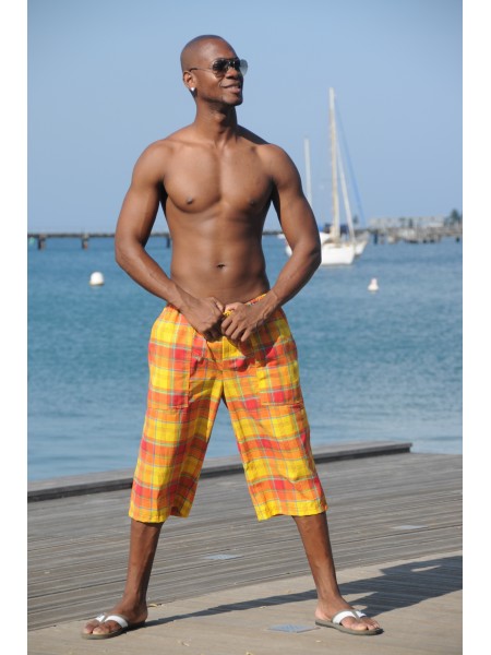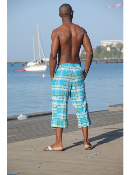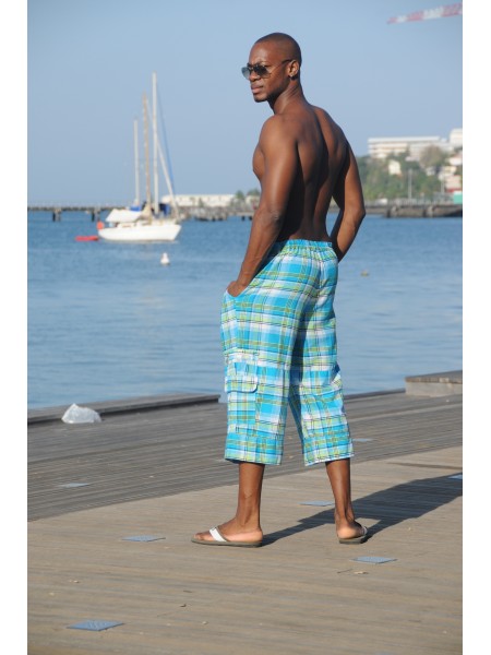 Bermudas sous les genoux avec des poches pour Homme en madras, élastique et réglable à la taille sympas à porter aux couleurs des Antilles, existe dans toutes les tailles.