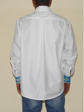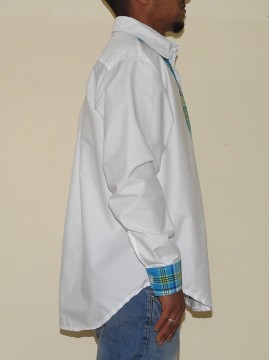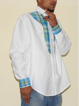 Chemise madras boutonnée à manches longues, col relevé et une poche sur la poitrine gauche avec une légère pointe de Madras.