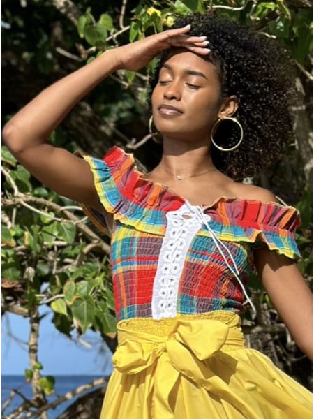 Vêtement antillais pour homme. Chemise à demi-manches, col relevé, avec boutonnage. Bermuda avec élastique à la taille.