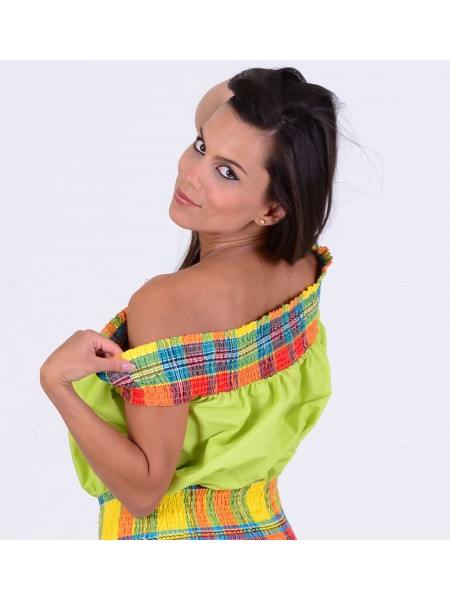 Un corsage original et magnifique pour compléter votre tenue créole ! Le corsage Coco de la jolie collection de Dody vous offre le confort tout en restant élégante par les smocks sur la taille et son col en bateau laissant exposer les belles épaules nues pour une apparence sexy agrémenté par un simple volant qui donne a ce corsage un effet spécial.