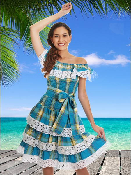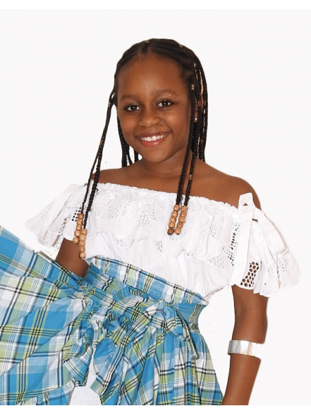 Adorable corsage antillais réalisé en coton, son décolleté bateau au volant froncé en broderie anglaise et son smock au niveau de la taille donneront un look chic.