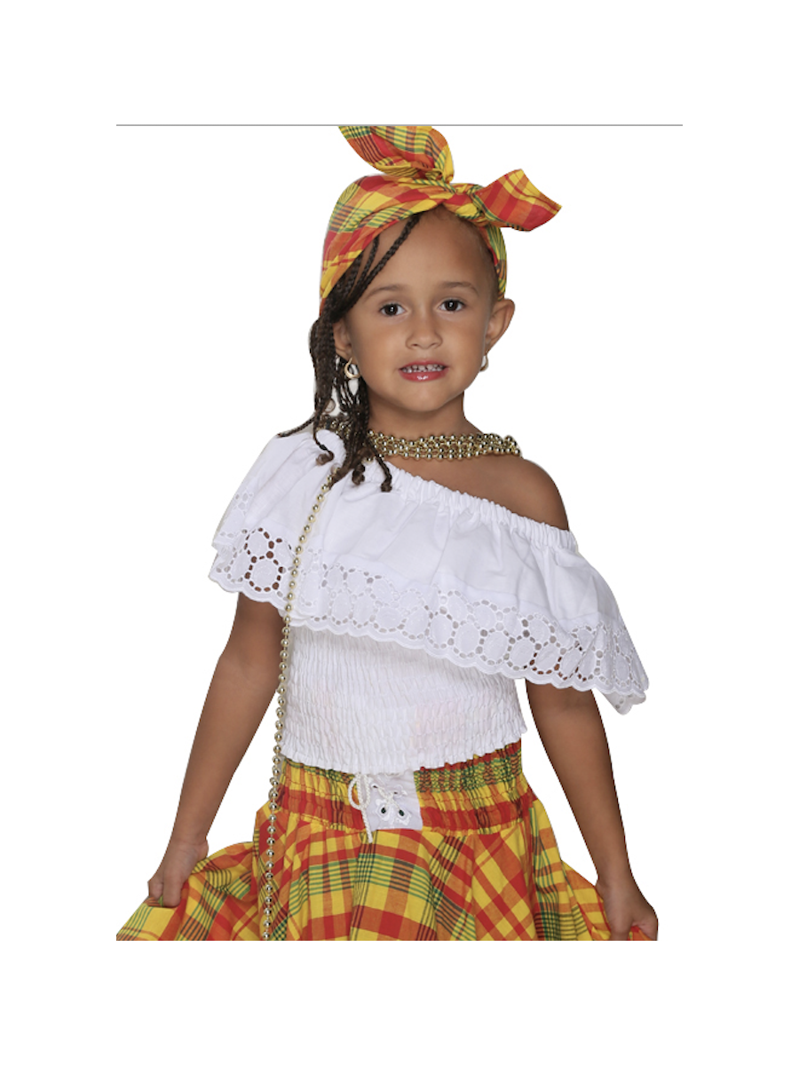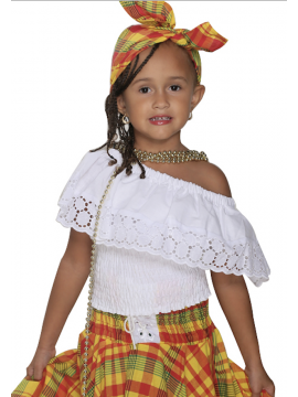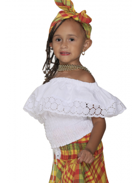 Corsage smocké au niveau du buste, col en bateau souligné d'un volant brodé, peut être accompagné d'une jupe de la collection Dody.