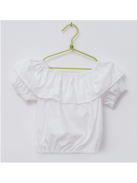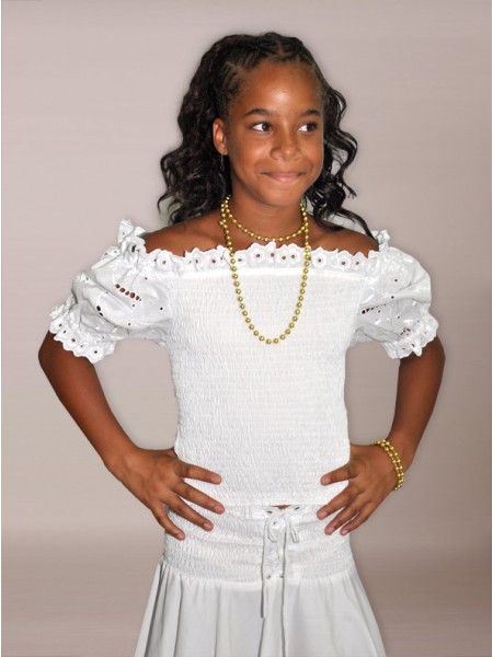 Adorable corsage antillais réalisé en coton, son décolleté bateau au volant froncé et son smock au niveau des bustes donneront un look chic.