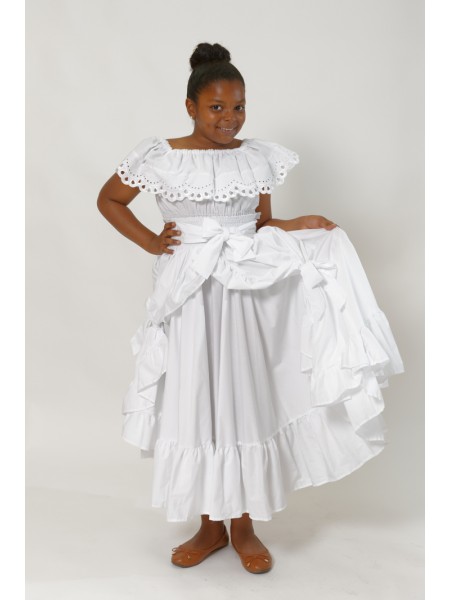 Adorable ensemble jupe antillais réalisé tout en coton, son décolleté bateau au volant froncé en broderie anglaise et son smock au niveau de la taille donneront un look chic.