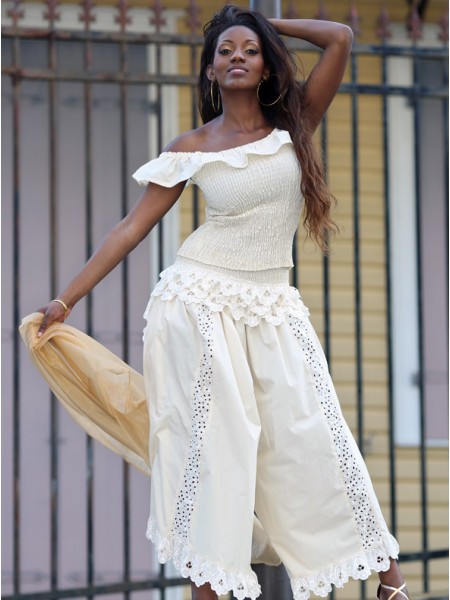 La beauté antillaise extreme avec l'ensemble Amazone de la collection Dody pour femmes. Cet ensemble en coton est ce qu'il vous faut pour compléter votre garde-robe avec des ces pièces idéales à porter ensemble comme une tenue parfaite pour les sorties avec les amies par sa légèreté et son style chic originale ou à porter séparément selon votre choix. La tenue Brigitte vous offre une apparence sexy tout en restant confortable par son corsage coton col en bateau agrémenté par d'un large volant avec des détails en broderie anglaise pour un effet spécial, laissant exposer les belles épaules nues et sa jupe légèrement flottante. Compléter l'ensemble avec des accessoires de votre choix.