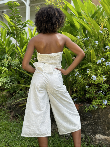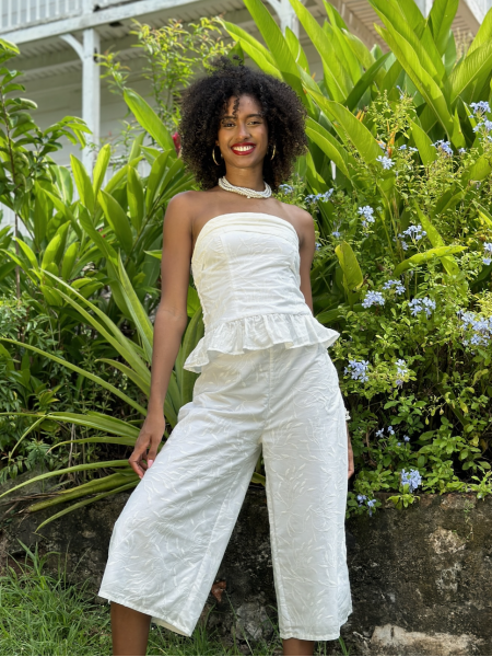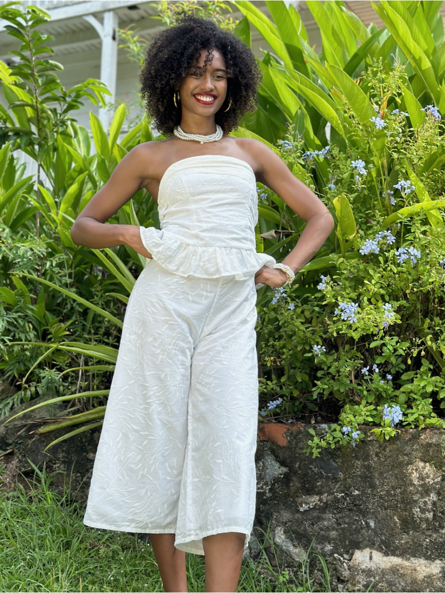 Jolie ensemble pantalon entièrement en véritable broderie simple accompagné d'un bustier entièrement smockés dans le dos.