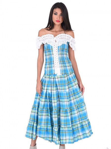 Ensemble créole madras: corsage en col bateau avec volant en fonces et cordelière dans le long du buste. Jupe antillaise longue et simple, avec fronces