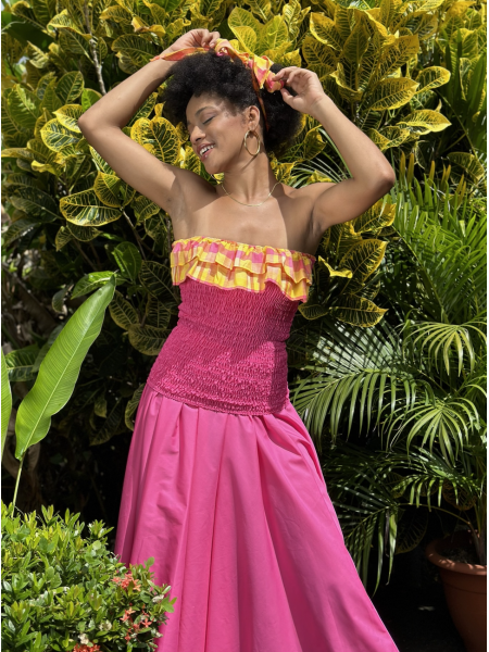 L’ensemble Arawak est la pièce idéale pour tout évènement traditionnelles. Cet ensemble représente parfaitement un mixe de sexy et chic pour les belles journées d’été mais aussi pour les soirée en famille. Pour ce vêtement madras de Dody, il est question d’originalité et de fantaisie par son joli corsage créole entre deux madras et coton laissant ainsi apparaitre les belles épaules nus et sa jupe longue évasée depuis la taille.