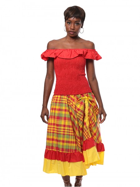 Ensemble corsage-jupe madras, corsage a col en bateau et en smocks. Jupe longue, ouverte de devant laissant apparaitre un jupon et un noeud à la taille.