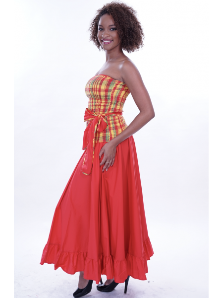 Bustier blanc tout en smocks, col en bateau avec large volant et cordelière de devant. Jupe longue en madras avec large bande élastique sur la taille.