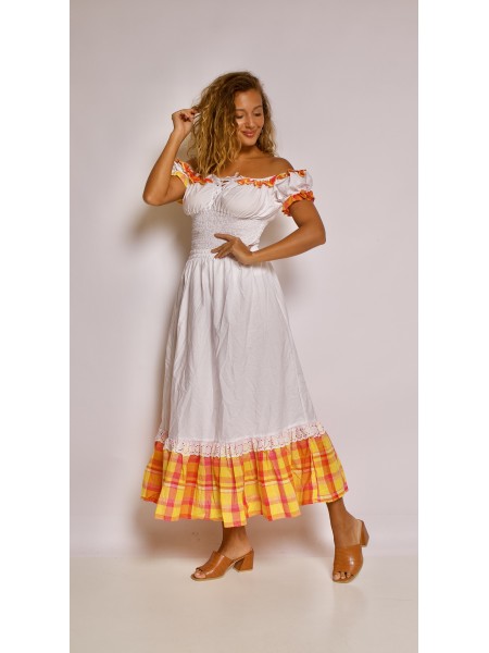 Ensemble madras original ! Corsage créole long, volant au niveau du décolleté et une ceinture à nouer. Jupe créole longue, smocks à la taille, volant sur le bas.