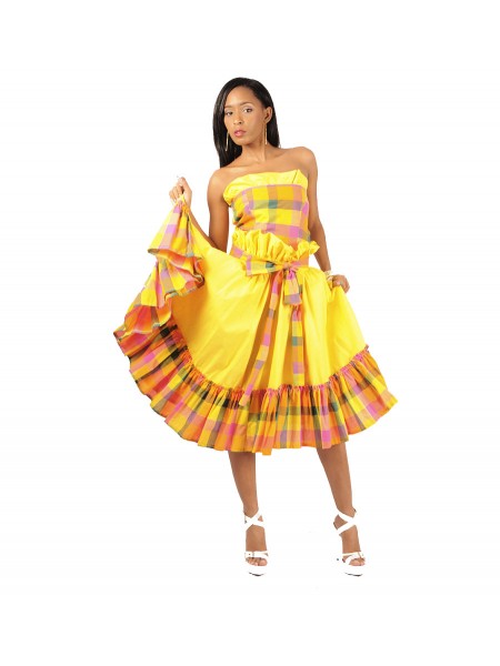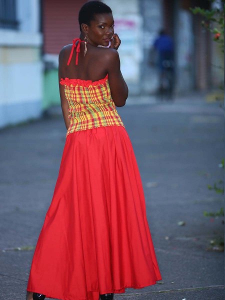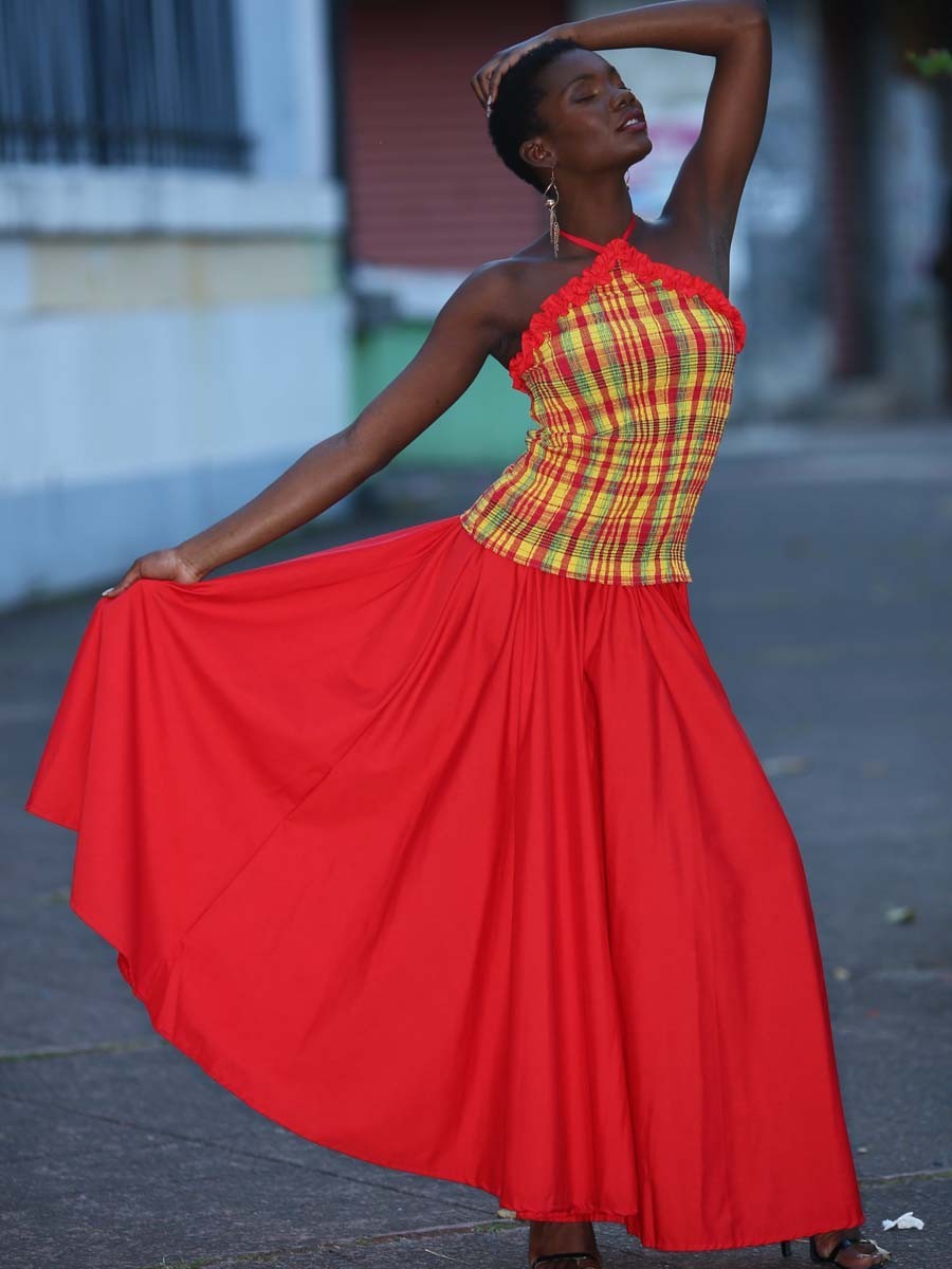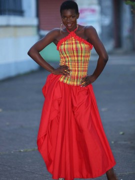 Célébrer les évènements d'été n'a besoin que d'une tenue légère, élégante et confortable tel l'ensemble Grenade. Cet magnifique ensemble entre deux madras et coton du style antillais est just ce qu'il vous faut pour attirer l'attention par son buste noué a la nuque laissant apparaitre les belles épaules nues. L'originalité de cette tenue réside dans sa jupe flotante et légère. L'ensemble Hibiscus peut facilement être jumelé avec des talons et des accessoires.