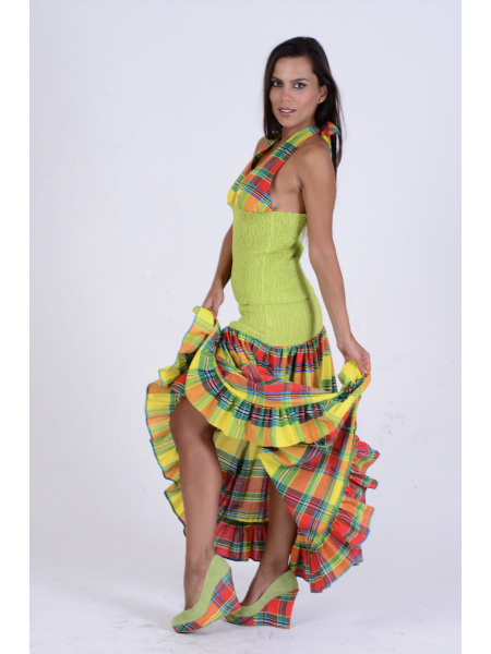 Corsage madras entièrement en smocks, dos nu avec de bretelles nouées dans la nuque et fronces agrémentant le haut. Jupe longue évasée, simple et légère