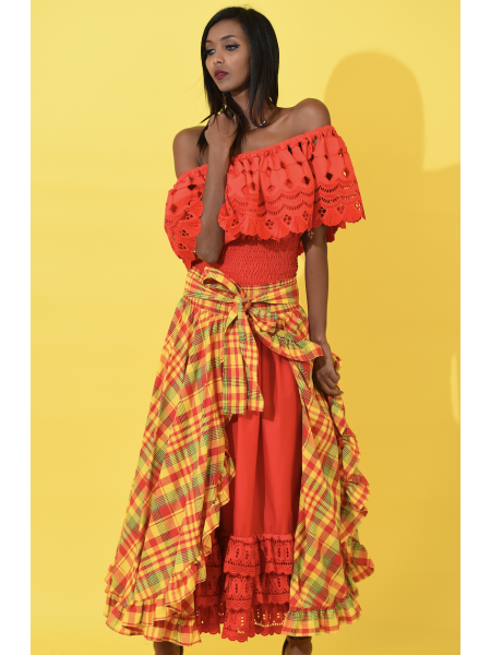 Ensemble creole du style antillais tout en madras. Corsage décolleté et short ayant deux poches sur les côtés.