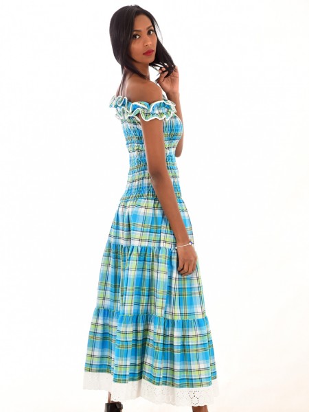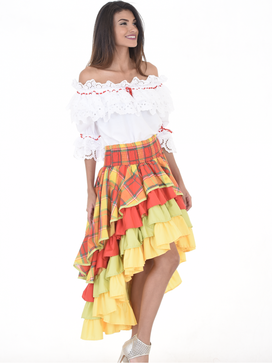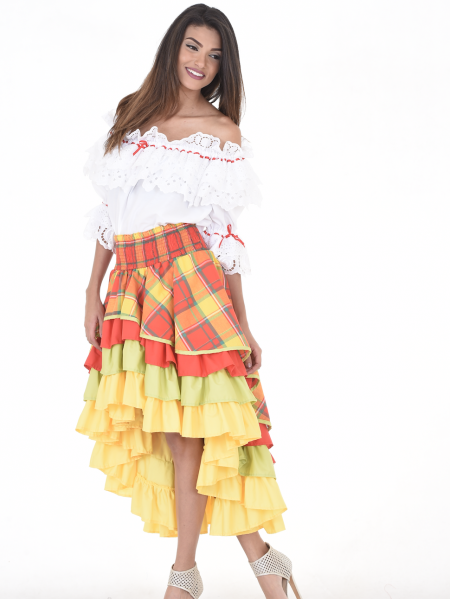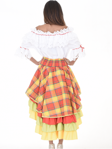Ensemble créole. Corsage ample, col en bateau et manches trois-quarts finalisés par un large volant souligné d’un ruban de satin. Jupe longue en madras et une ceinture nouée au niveau de la taille en smocks