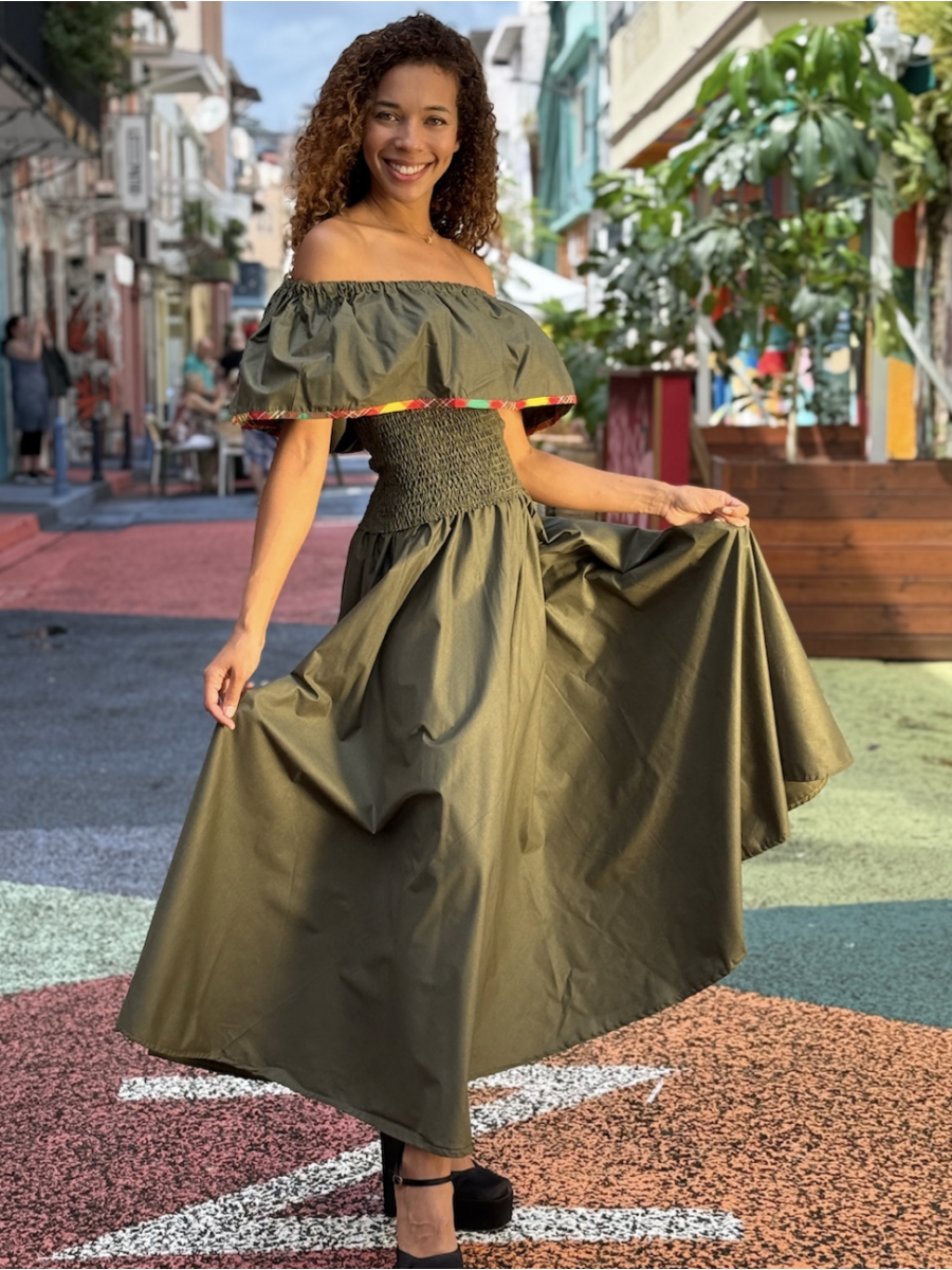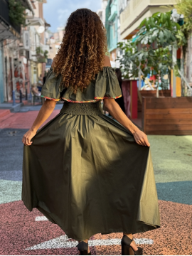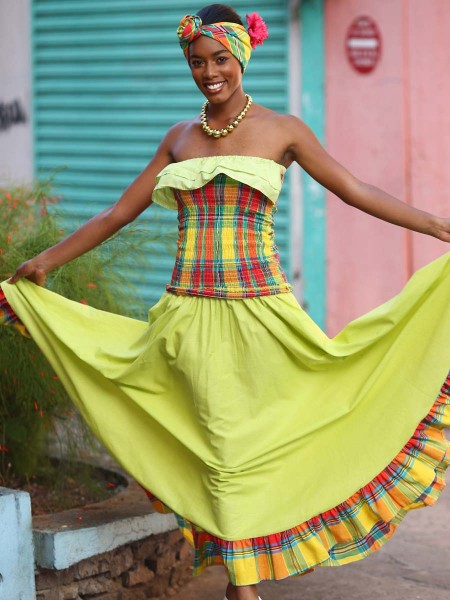 Bustier en madras décolleté avec volant, tout en smocks. Jupe longue avec des volants en madras vers le bas