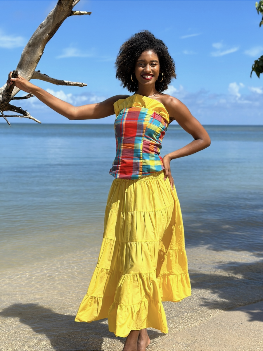 Ensemble créole. Corsage ample, col en bateau et manches trois-quarts finalisés par un large volant souligné d’un ruban de satin. Jupe longue en madras et une ceinture nouée au niveau de la taille en smocks