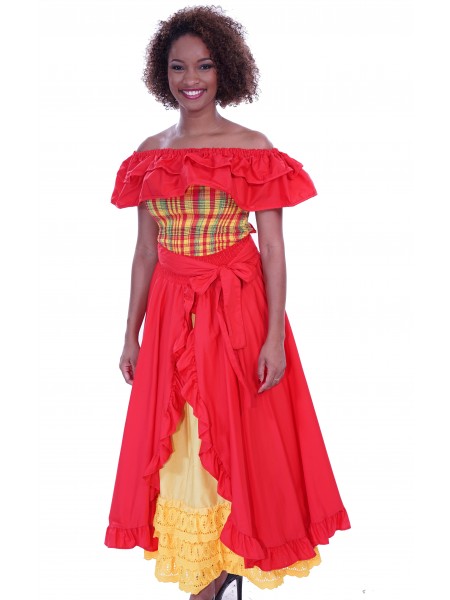 Costume créole qui peut être défilé le jour ou la nuit. Cet ensemble en madras est la tenue idéale pour tout évènement en famille ou entre amies. Le corsage smocké de l'ensemble Sacha lui permet d'être à la fois confortable et élégante, sa poitrine en V et dos nu donne à la tenue une apparence sexy pour pouvoir attirer l'attention. Sa jupe Sacha antillaise en madras ouverte devant laissant apparaitre des volants en coton blanc rendent cet ensemble original et unique. L'ensemble Sacha peut parfaitement être jumelé avec des accessoires de votre choix.