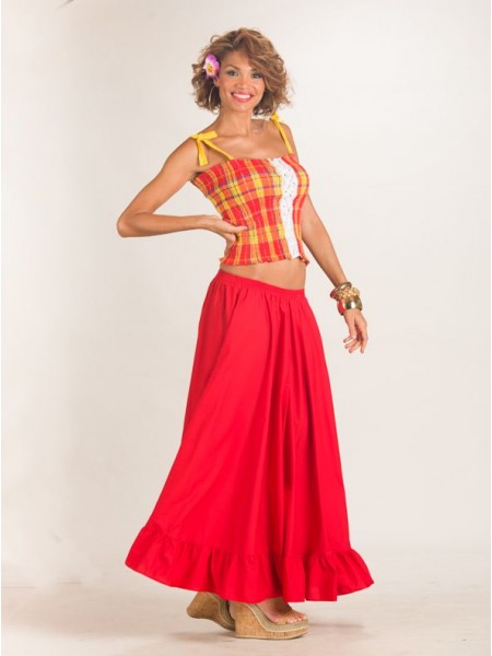 Ensemble créole. Corsage ample, col en bateau et manches trois-quarts finalisés par un large volant souligné d’un ruban de satin. Jupe longue en madras et une ceinture nouée au niveau de la taille en smocks