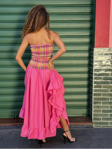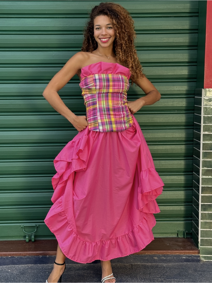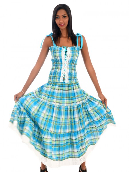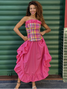 Jolie ensemble jupe en coton accompagné d'un bustier en madras entièrement smockés dans le dos.