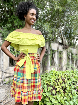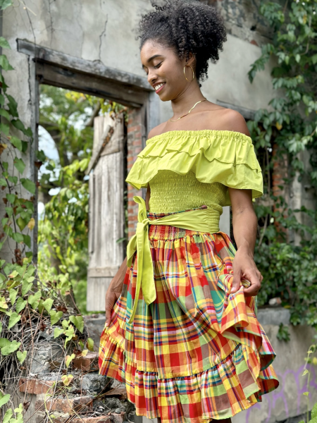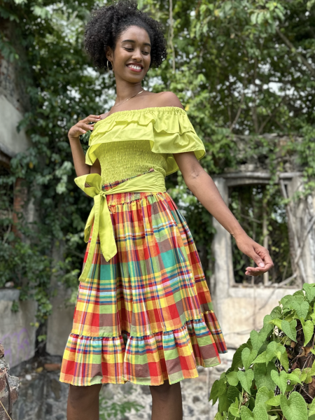 Entièrement en madras, la jupe en Madras Tradionnel, donnera avec sa coupe évasé, une allure particulière toujours recherchée par l’élégante femme des îles. elle joue la carte de la vraie représentation des caraïbes françaises.