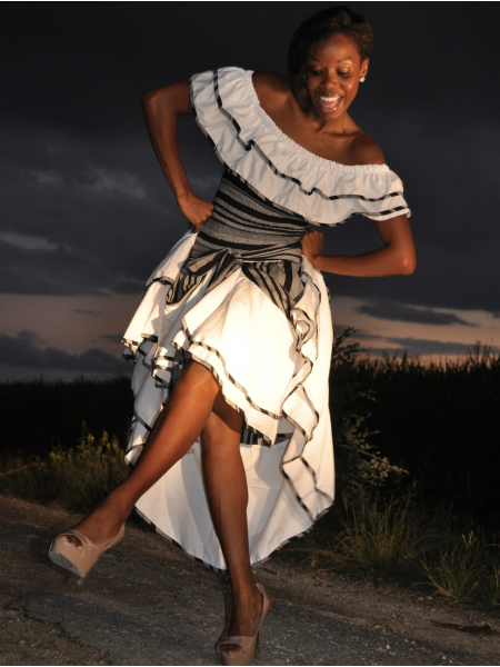 Ensemble créole. Corsage ample, col en bateau et manches trois-quarts finalisés par un large volant souligné d’un ruban de satin. Jupe longue en madras et une ceinture nouée au niveau de la taille en smocks