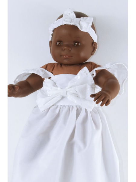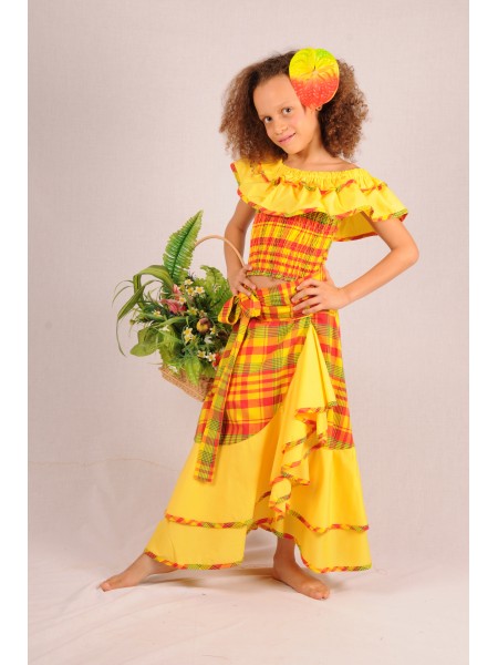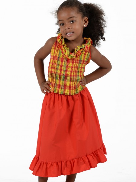 Ensemble créole pour fille antillaise. Bustier entièrement en smocks, dos nu. Jupe d’une longueur qui dépasse un peu les genoux, smocks au niveau de la taille.