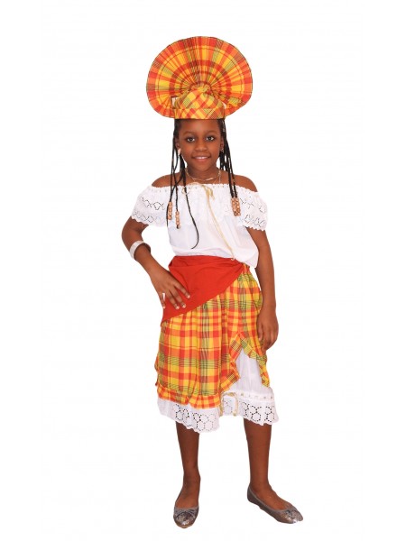 Entièrement en madras, la longue jupe et son corsage en coton créole, donnera avec sa coupe évasé, une allure particulière toujours recherchée par l’élégante fille des îles. Buste qui se distingue par son col en bateau souligné d'un volant et d'un élastique dévoilant la beauté des épaules ; le haut elle joue la carte de la vraie représentation des caraïbes françaises. Vendu avec sa coiffe