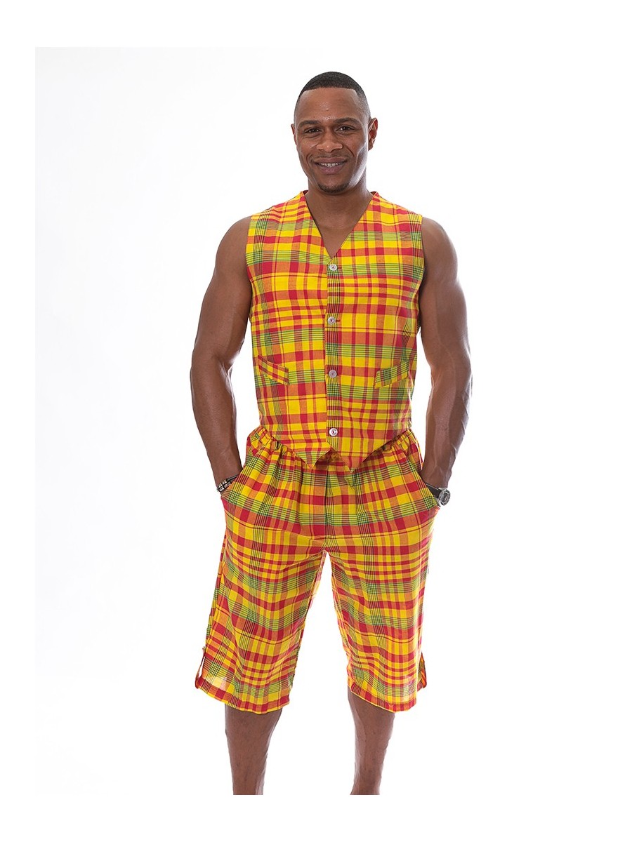 Ensemble bermudas sous les genoux avec des poches pour Homme en madras, élastique et réglable à la taille sympas à porter aux couleurs des Antilles, existe dans toutes les tailles et aux différentes couleurs.