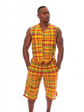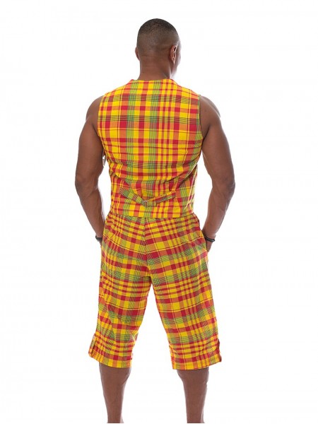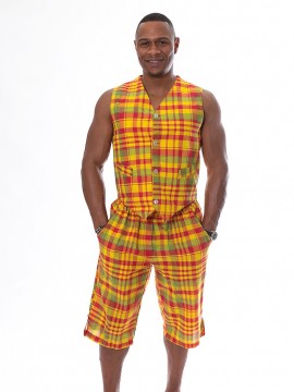 Ensemble Gilet et Bermuda style créole en madras. Gilet relevé par deux fausses poches et une petite ceinture dans le dos pour resserer la taille selon la convenance.