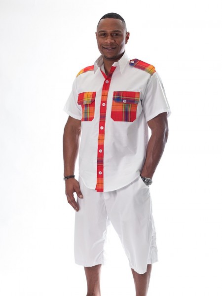 Vêtement antillais pour homme. Chemise à demi-manches, col relevé, avec boutonnage. Bermuda avec élastique à la taille.