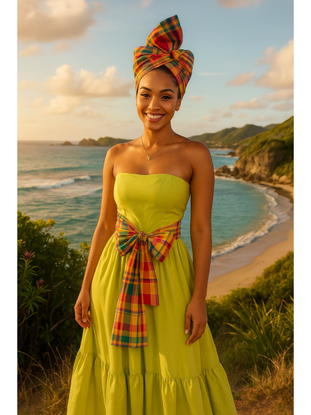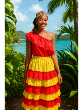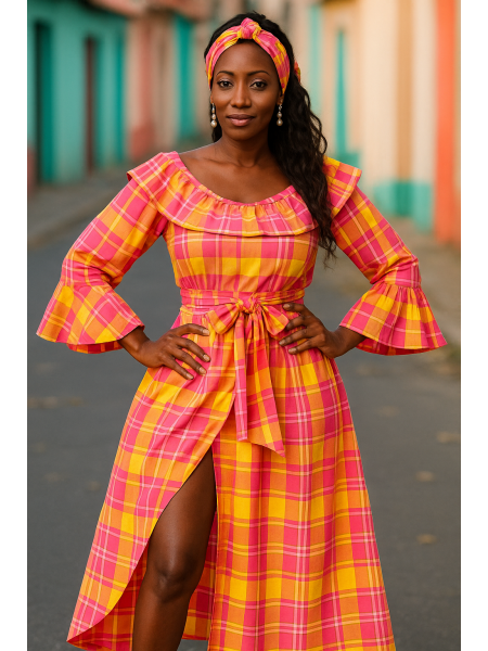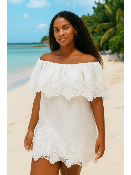 Robe en Broderie créole du style antillais. Coupe courte du devant et longue du derriere