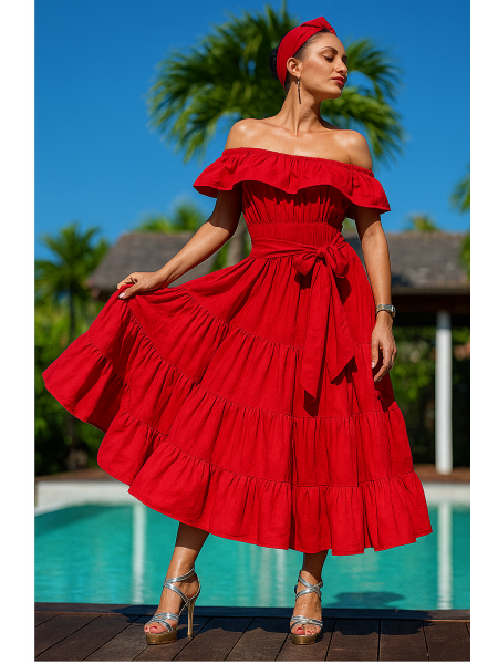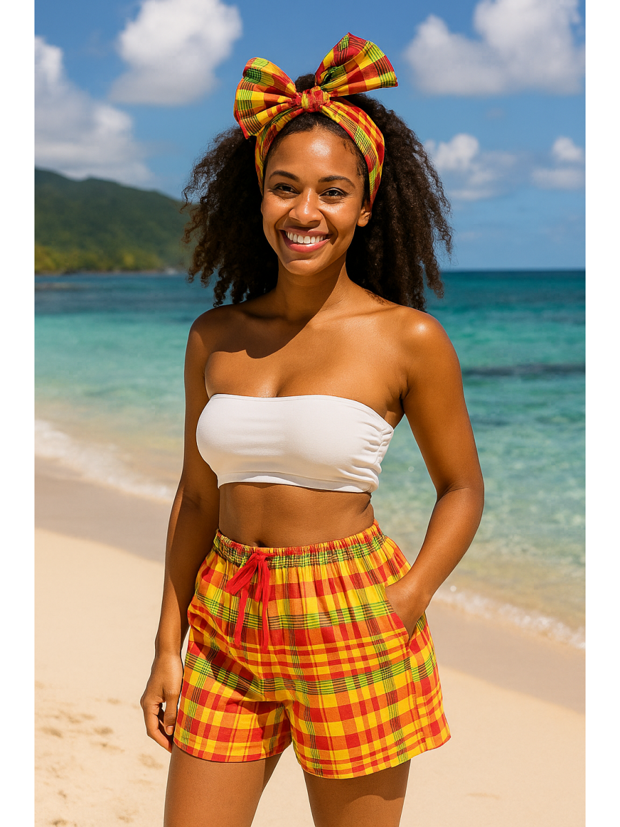 Ensemble créole. Corsage ample, col en bateau et manches trois-quarts finalisés par un large volant souligné d’un ruban de satin. Jupe longue en madras et une ceinture nouée au niveau de la taille en smocks