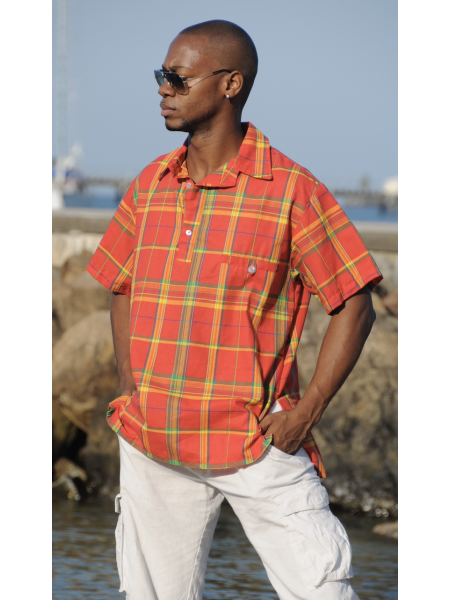 Ensemble avec sa Chemise à manche longue, une poche en Madras sur un côté, des boutons sur le devant accompagné de son gilet.