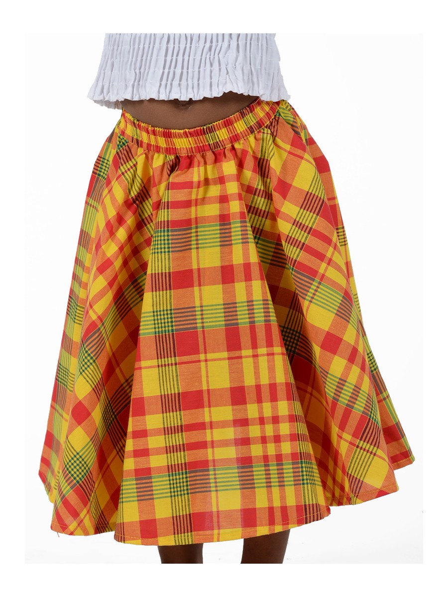 Entièrement en madras ou en coton uni, la longue jupe créole Lambada avec sa coupe évasée est ideale pour la jeune fille antillaise.