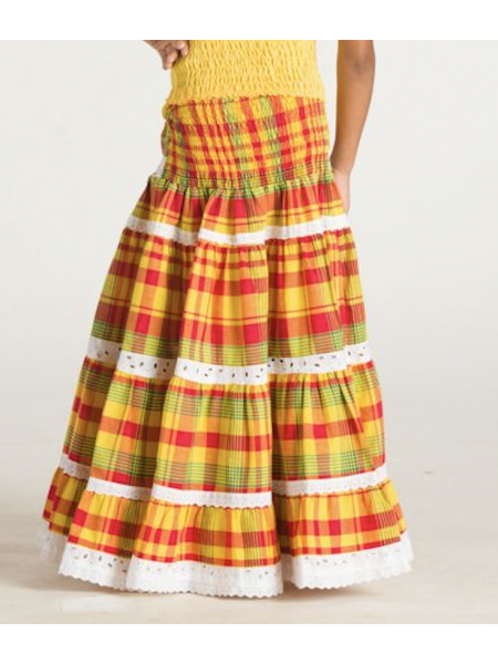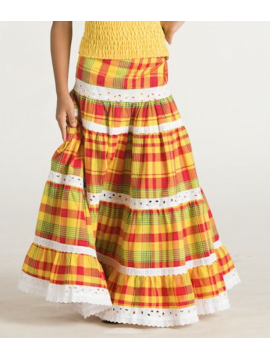 Bustier blanc tout en smocks, col en bateau avec large volant et cordelière de devant. Jupe longue en madras avec large bande élastique sur la taille.