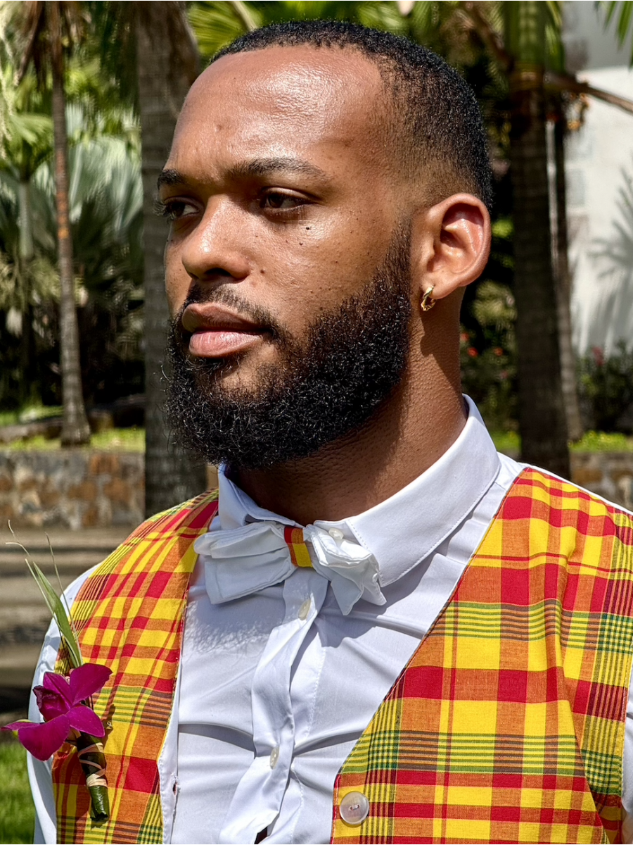 Toute tenue créole masculine peut-être accompagnée d'un accessoire tel que cet attirant nœud papillon en coton avec une légère pointe de madras qui se ferme de derrière à l'aide d'un velcro.