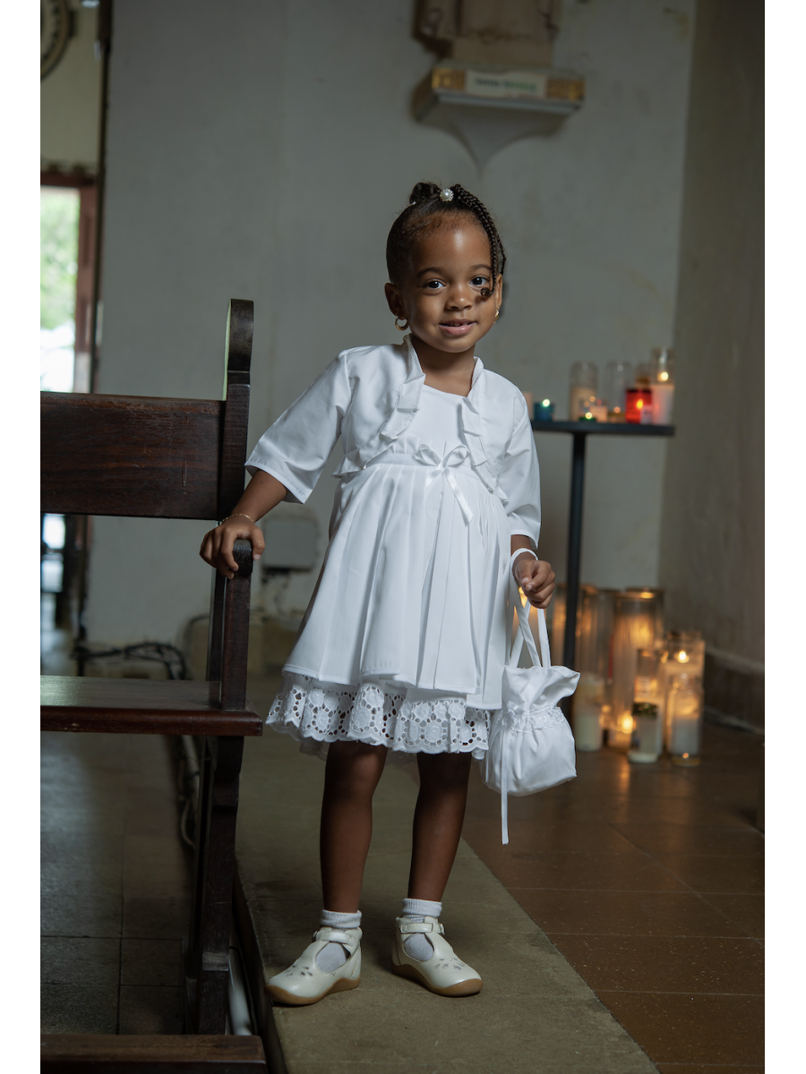 Sublime robe de Baptême mi longue tout en coton dans un blanc pure, facile à porter accompagner de son joli boléro.