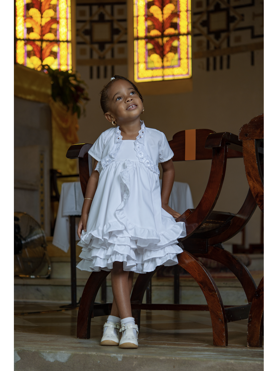 Sublime robe de Baptême mi longue tout en coton dans un blanc pure, facile à porter accompagner de son joli boléro.