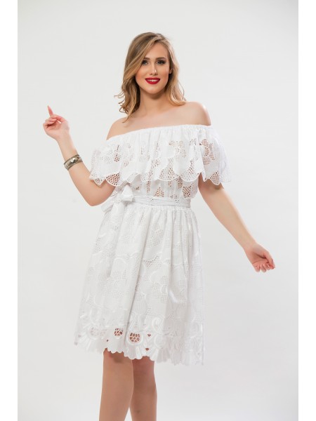 Robe créole avec un col en bateau et manches amples, tous ornés de broderie anglaise, ouverture de devant et ceinture à nouer au niveau de la taille.