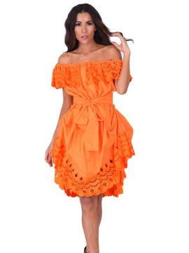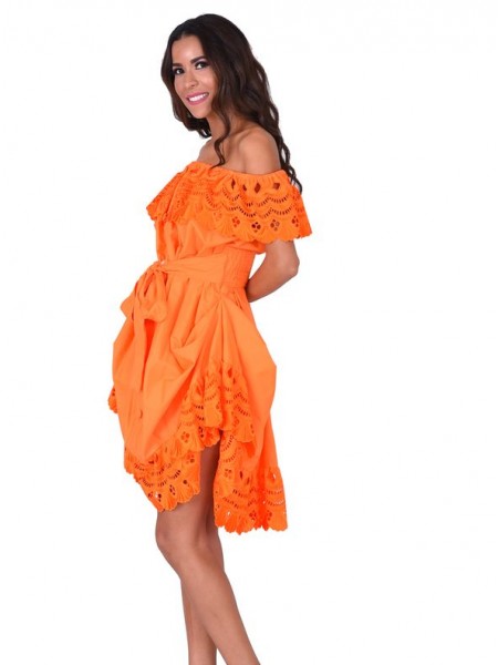 La fusion de mode et de confort dans la robe créole Hillary de Dody ... En bustier charmant la nudité des épaules, évasée, ajustée à la taille par des smocks sur le dos et une ceinture fantaisiste nouée au-dessous de la poitrine. Réalisée tout en broderie anglaise.