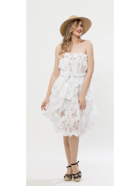 Robe décolletée réalisée en coton uni, la broderie creole vient à trois reprises souligner le haut, la ceinture nouée à la taille et le bas en léger volant froncé.-