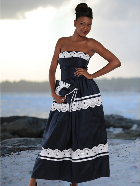 Robe décolletée réalisée en coton uni, la broderie creole vient à trois reprises souligner le haut, la ceinture nouée à la taille et le bas en léger volant froncé.-