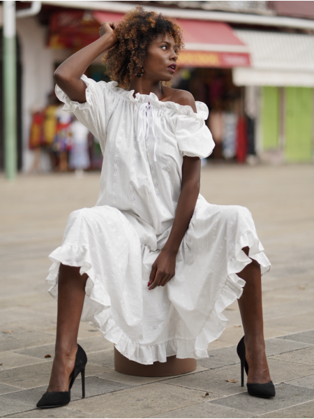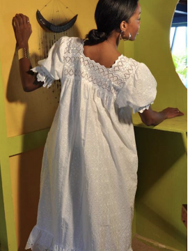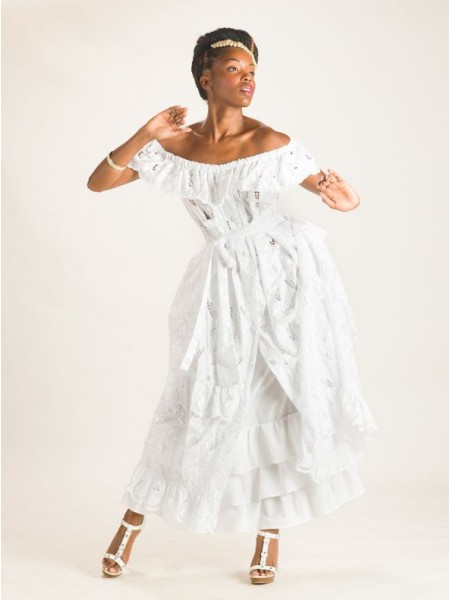 Entièrement en broderie simple blanche, la robe Ivette est un des modèles Traditionnel, donnera avec sa coupe évasé, une allure particulière toujours recherchée par l’élégante femme des îles. Buste avec une bande en broderie anglaise ; le haut elle joue la carte de la vraie représentation des caraïbes françaises.