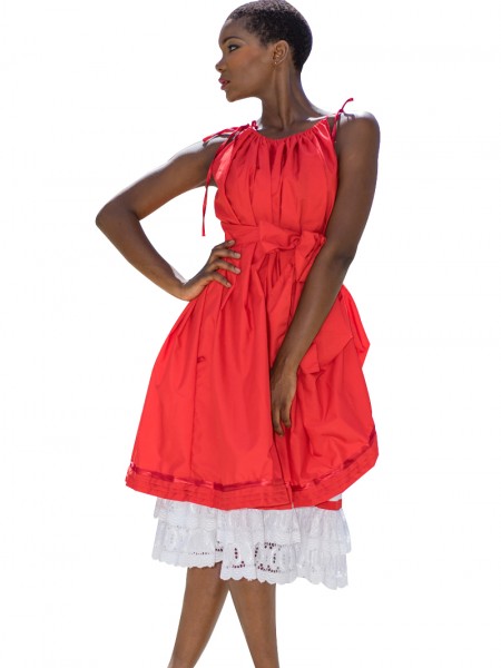 Robe décolletée réalisée en coton uni, la broderie creole vient à trois reprises souligner le haut, la ceinture nouée à la taille et le bas en léger volant froncé.-
