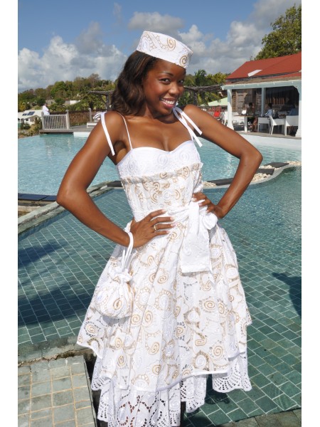 Robe décolletée réalisée en coton uni, la broderie creole vient à trois reprises souligner le haut, la ceinture nouée à la taille et le bas en léger volant froncé.-