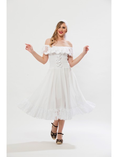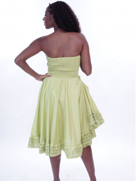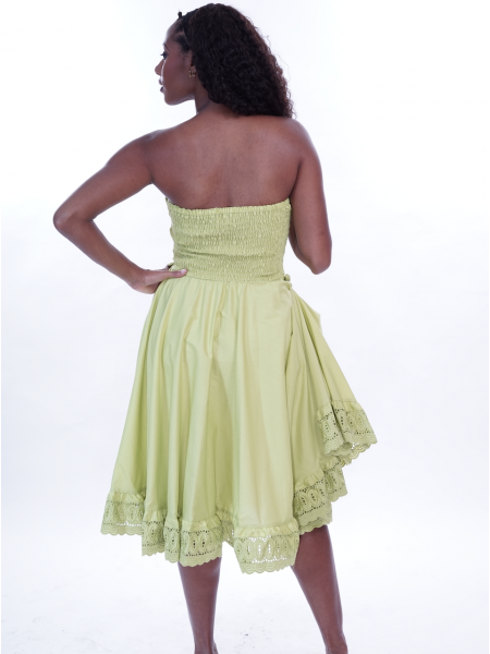 Robe décolletée réalisée en coton uni, la broderie creole vient à trois reprises souligner le haut, la ceinture nouée à la taille et le bas en léger volant froncé.-
