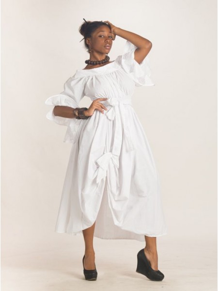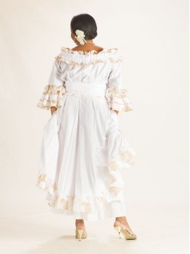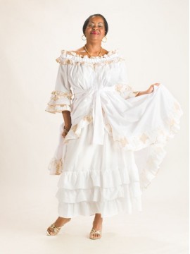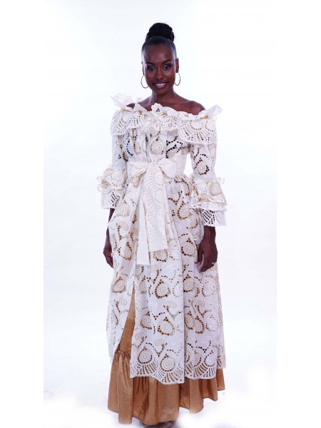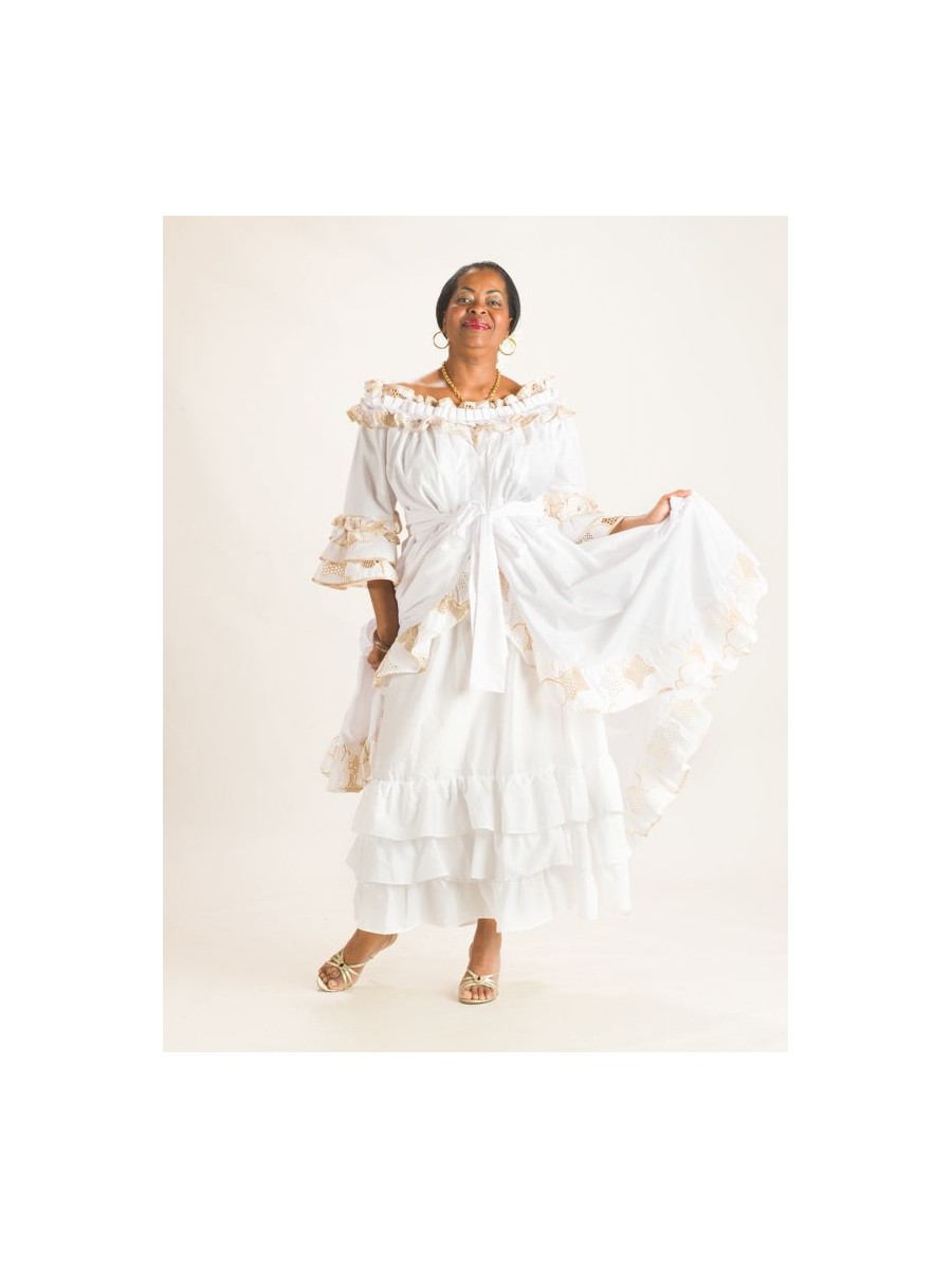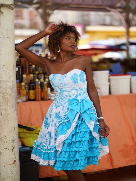 EntiĂšremen en coton et en broderie Anglaise, la robe Zya est un des modĂšles Traditionnel, donnera avec sa coupe Ă©vasĂ©, une allure particuliĂšre toujours recherchĂ©e par lâĂ©lĂ©gante femme des Ăźles. Buste qui se distingue par son col en bateau soulignĂ© d'un volant et d'un Ă©lastique dĂ©voilant la beautĂ© des Ă©paules ; le haut elle joue la carte de la vraie reprĂ©sentation des caraĂŻbes françaises.